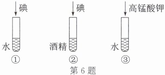 6. 同学们在实验室中做了试管①和试管②的对比实验(如图所示),发现试管②中固体可溶,试管①中固体几乎不溶,该对比实验说明了影响物质溶解性的因素是