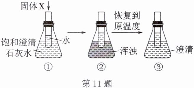 答案:11.A 解析:氢氧化钙的溶解性随温度的升高而减弱,故升高温度则会析出固体,因此加入的X可以是氢氧化钠、生石灰等,如果是氢氧化钠固体,那么是溶解放热,发生的是物理变化,如果是生石灰,那么是与水反应放热,发生的是化学变化,硝酸铵溶于水吸热,使温度降低,不能使氢氧化钙析出,C、D选项错误;图③中溶液又变澄清,是温度恢复至室温后,析出的固体再次溶解在原来的水中,依然形成饱和溶液,所以①②③都是饱和溶液,溶质质量分数的大小关系为①=③>②,A选项正确。饱和澄清石灰水变浑浊是因为温度升高氢氧化钙的溶解性减弱,导致部分氢氧化钙不能再溶解而析出,B选项错误。