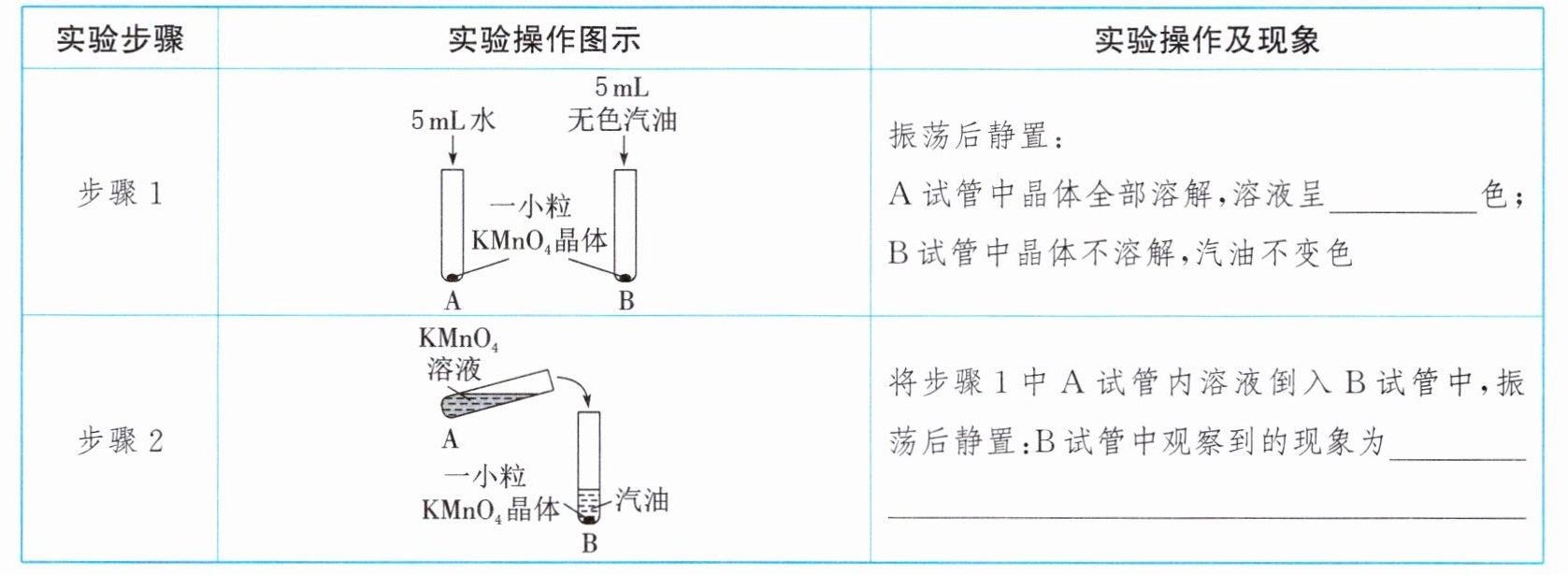 10. (科学思维)为了探究相同条件下同种溶质在不同溶剂中的溶解性,某兴趣小组同学进行如下两组实验。(提示:本实验所用汽油与 KMnO₄、碘均不发生化学反应)