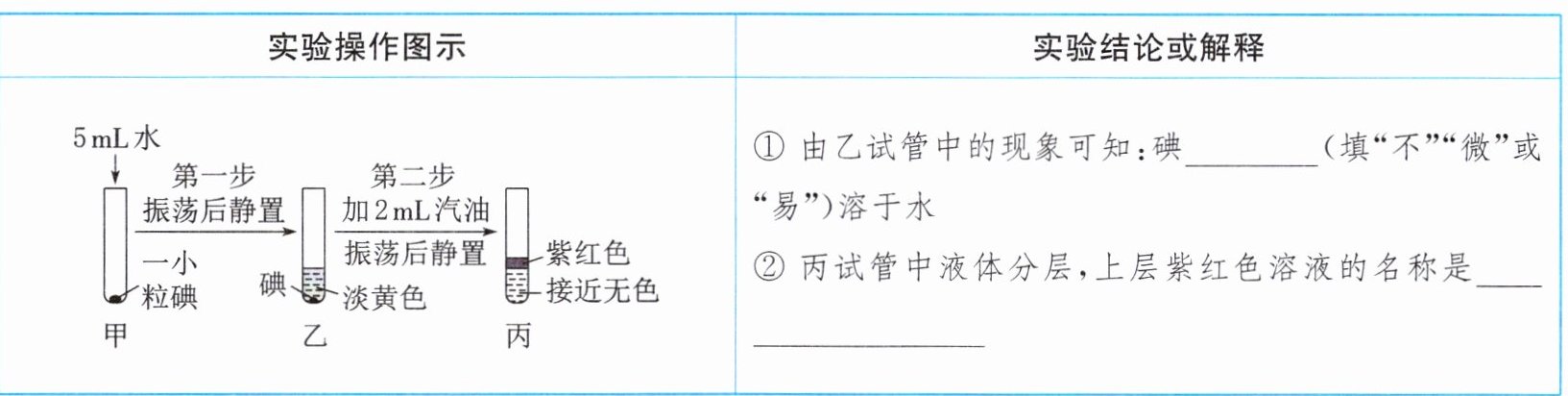。答案:10.【实验1】紫红 液体分层,上层为无色,下层为紫红色,试管底部无固体残留 【实验2】① 微 ②碘的汽油溶液 【反思与应用】(1)不分层 (2)与水不互溶,碘在这种液体中的溶解性远强于在水中的溶解性