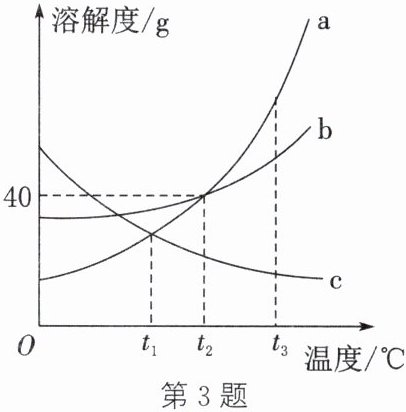 D.$ t_3^{\circ}C $ 时,a、b、c 的溶解度由大到小的关系是 $ c > b > a $