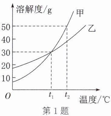 D.分别将 $ t_2^{\circ}C $ 时甲、乙的饱和溶液降温至 $ t_1^{\circ}C $,所得溶液的溶质质量分数相等