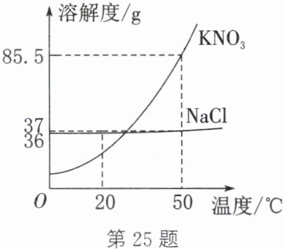25. (2024·南京改编)实验探究是化学科学研究的基本方法。根据表中实验及图中氯化钠和硝酸钾的溶解度曲线,回答下列问题。(忽略溶解时的热量变化和加热时水的蒸发)