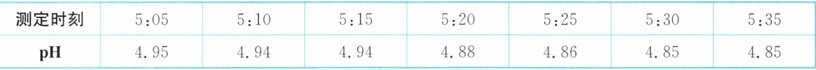 4. 智慧小组的同学取刚降到地面的雨水为水样,每隔5min测一次pH,其数据如表: