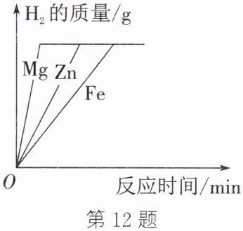 12. 等质量、等溶质质量分数的稀盐酸分别与足量的 Mg、Fe、Zn 三种金属充分反应,放出氢气的情况如图所示。