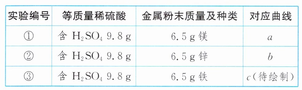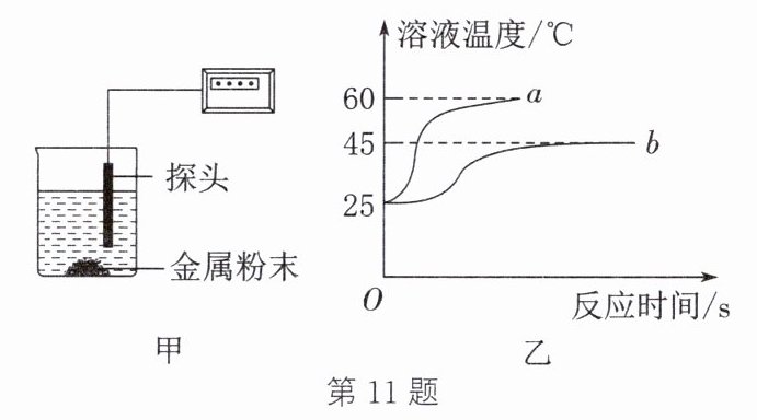 11. (数字化实验)某实验小组拟利用相同条件下等质量的同种酸溶液与金属反应来探究“金属活动性与反应放出热量”之间的关系,实验装置如图甲;实验完成后,根据传感器探头测量的从反应开始到反应停止时的数值绘制的曲线图如图乙;实验所用酸与金属粉末的种类和质量如表。请回答问题并进行相关计算。