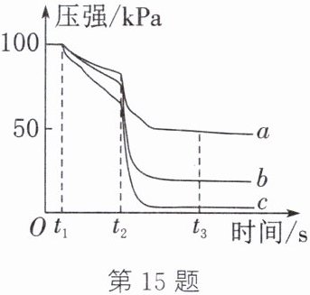答案:15.C 解析:0~t₁ s呈现这种形态是因为没有注入氢氧化钠溶液,A选项错误;t₁~t₂ s曲线呈现这种形态是因为注入氢氧化钠溶液后,未进行振荡,氢氧化钠和二氧化碳缓慢反应,B选项错误;据图可知,t₃ s时烧瓶内压强由大到小的顺序是 a>b>c,C选项正确;a、b、c三种曲线所对应的实验中,压强越大,说明被吸收的二氧化碳体积越小,t₃ s时被吸收的二氧化碳的体积由大到小的顺序是 c>b>a,D选项错误。