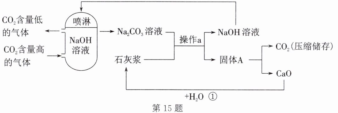 (写一种即可)。答案:15. (1) 增大反应物之间的接触面积,使反应更充分,反应速率更快 2NaOH+CO₂ =Na₂CO₃ + H₂O (2) 过滤 (3) 碳酸钙 放热 (4) NaOH(或氢氧化钠) (5) 绿色出行(合理答案均可)