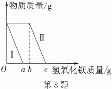 答案:8.D 解析:由图像知,Oa段是硫酸与氢氧化钡反应,bc段是氯化镁与氢氧化钡反应,ab段是盐酸与氢氧化钡反应,则该溶液含有硫酸、盐酸和氯化镁,选项A的说法正确。由于硫酸与氢氧化钡反应会立即产生沉淀,所以曲线Ⅰ表示硫酸的质量变化情况,选项B的说法正确。Oa段是硫酸与氢氧化钡反应,bc段是氯化镁与氢氧化钡反应,硫酸和氯化镁的质量相等。设硫酸和氯化镁的质量均为$m$。
