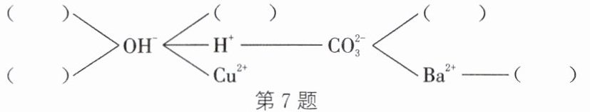 7.【练习书写】①$\mathrm{Na_2CO_3 + H_2SO_4 \xlongequal{ } Na_2SO_4 + H_2O + CO_2 \uparrow}$ ②$2\mathrm{KOH + H_2SO_4 \xlongequal{ } K_2SO_4 + 2H_2O}$ ③$\mathrm{Na_2CO_3 + BaCl_2 \xlongequal{ } BaCO_3 \downarrow + 2NaCl}$【研究讨论】$\mathrm{OH^-}$和$\mathrm{H^+}$ $\mathrm{CO^{2-}_3}$和$\mathrm{Ba^{2+}}$【构建网络】如图所示($\mathrm{Mg^{2+}}$、$\mathrm{Fe^{3+}}$、$\mathrm{NH^+_4}$位置可互换)【拓展运用】$\mathrm{AgNO_3}$