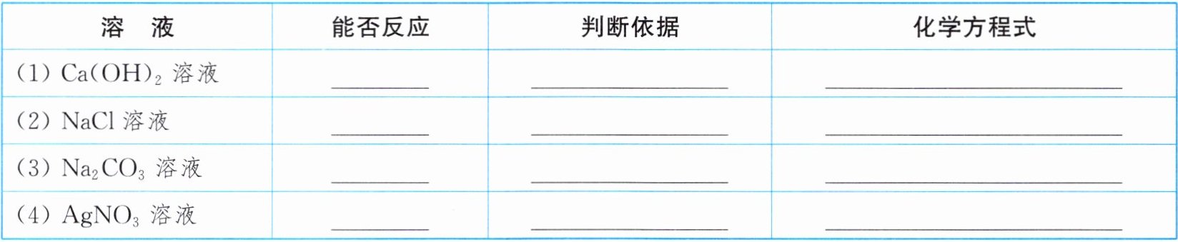 9. 根据复分解反应发生的条件,判断稀盐酸与下表中的四种溶液之间能否发生反应,并写出判断的依据;若能反应,写出化学方程式。