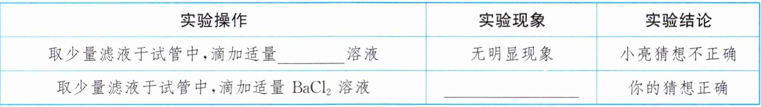 【作出猜想】小红:是$NaCl$。小亮:是$NaCl$、$BaCl_{2}$。小明:是$NaCl$、$BaCl_{2}$、$Na_{2}SO_{4}$。