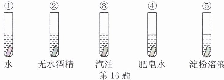 16. (生活实践)小明到医院输液,不小心将护士手中的托盘打翻,碘酒洒在了白衬衣上,白衬衣上立即出现了一大块紫黑色的痕迹。为了找到去除该痕迹的最好方法,小明与几名同学进行了探究,提出了以下几个方案并进行实验:①用水洗;②用无水酒精洗;③用汽油洗;④用肥皂水洗;⑤用淀粉溶液洗。请你与他们一起探究,并回答下列问题。