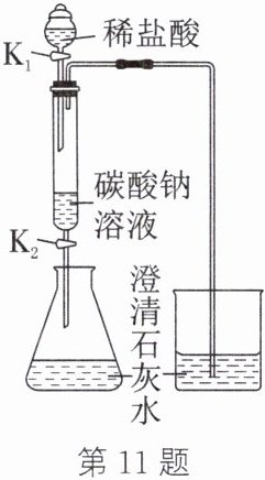 11. (2025·河南)某同学设计如图所示装置进行实验(夹持仪器略去,${K_{1}}$、${K_{2}}$均关闭)。打开${K_{1}}$,待液体全部流下,关闭${K_{1}}$,观察到烧杯中的溶液变浑浊;充分反应后,打开${K_{1}}$、${K_{2}}$,使液体全部流入锥形瓶,瓶中无明显现象。