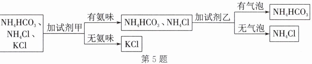 5. 如图是某同学鉴别NH₄HCO₃、NH₄Cl、KCl三种化肥的过程,其中试剂甲和乙分别可能是(