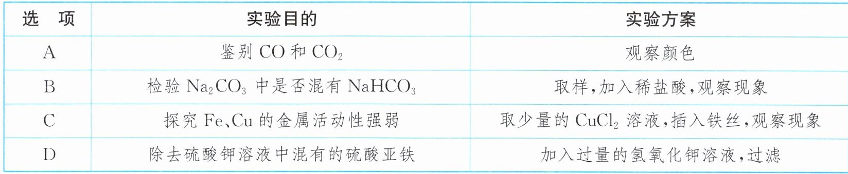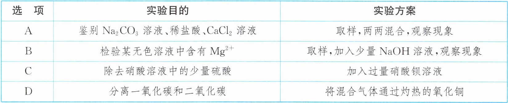 D选项,分离一氧化碳和二氧化碳,将混合气体通过灼热的氧化铜,一氧化碳与氧化铜反应生成二氧化碳,无法分离得到一氧化碳,方案错误。
