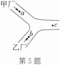 5. 甲、乙两厂分布如图所示,箭头代表水流方向。两厂排放的废水中含有 K⁺、Cu²⁺、Ag⁺、NO₃⁻、OH⁻、Cl⁻ 六种离子,两厂分别含有其中不同的三种离子。若在 a 处取水样进行检测,则废水的 pH 大于 7;两厂废水按适当比例混合,可将废水中的某些离子转化成沉淀,这样处理后 c 处的废水就可以达到排放标准。下列有关说法错误的是(