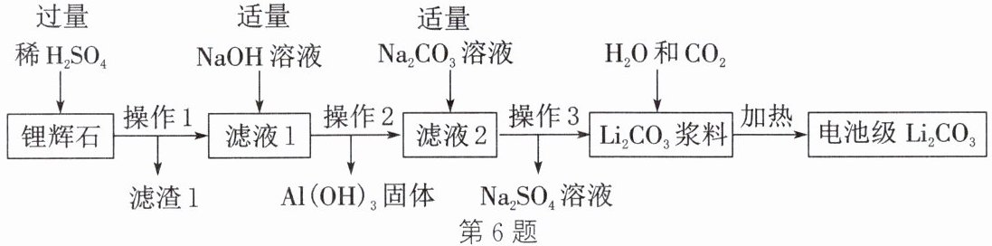 6. (2025·贵州)碳酸锂($ {Li_{2}CO_{3}} $)是制备新能源汽车电池的重要原料。利用锂辉石(主要成分为 $ {Li_{2}O} $、$ {Al_{2}O_{3}} $、$ {SiO_{2}} $)制备 $ {Li_{2}CO_{3}} $ 的流程如图: