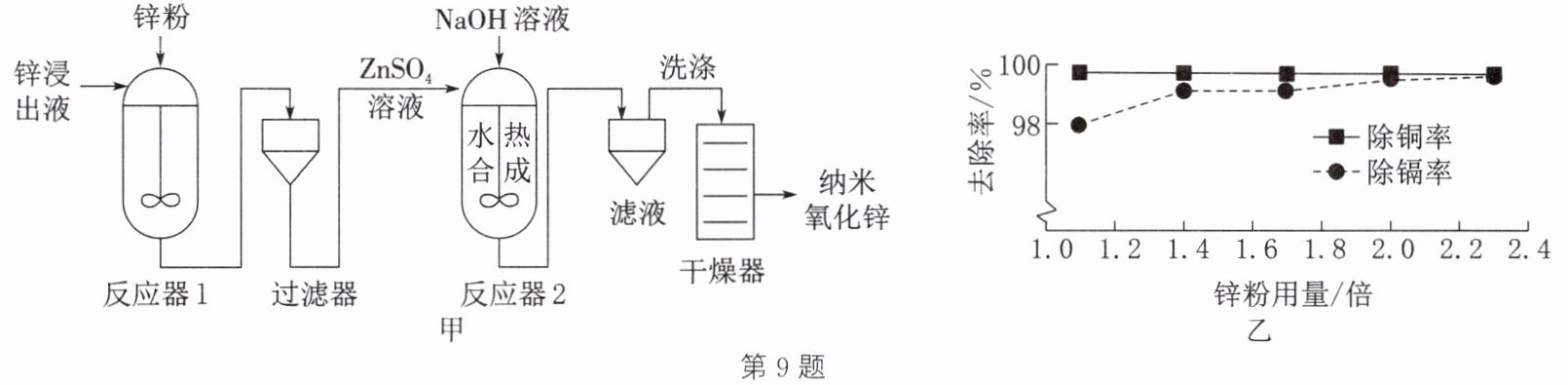 9. (2025·安徽改编)纳米氧化锌是一种新型高功能材料。工业上利用锌浸出液(主要含 $ {ZnSO_{4}} $、$ {CuSO_{4}} $ 和 $ {CdSO_{4}} $ 等)通过水热法制备纳米氧化锌,主要流程示意图如图甲:
