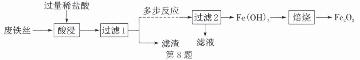 8. (2025·云南改编)现代绘画的红色颜料已很少使用赭石,而是通过化学方法制备 $ {Fe_{2}O_{3}} $。例如可用废铁丝(主要含铁和少量氧化铁,其余杂质不参与反应)制得,其工艺流程如图所示。