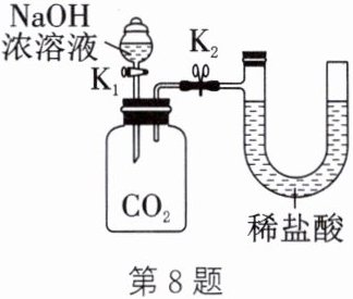 8. (创新实验)实验小组利用如图装置(气密性良好)探究NaOH溶液与CO₂的反应。先夹紧止水夹K₂,打开活塞K₁,待NaOH溶液完全进入集气瓶后立即关闭K₁,充分反应后,打开止水夹K₂,观察到稀盐酸进入集气瓶中。下列说法正确的是(