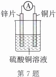 7. 如图所示,用导线将铜片和锌片分别连接电流表的正、负极,并将铜片和锌片插入硫酸铜溶液中即可构成化学电池。下列说法不正确的是 (