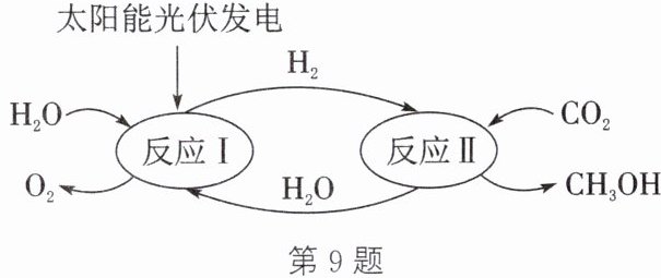 答案:9.C 解析:太阳能为可再生资源,A选项说法不正确;反应Ⅱ为氢气和二氧化碳反应生成水和$\mathrm{CH}_3\mathrm{OH}$,反应的化学方程式为$3\mathrm{H}_2+\mathrm{CO}_2\xlongequal{一定条件}\mathrm{H}_2\mathrm{O}+\mathrm{CH}_3\mathrm{OH}$,则反应Ⅱ中$\mathrm{H}_2$与$\mathrm{CO}_2$的质量比是$(3×1×2):(12 + 16×2)=3:22$,B选项说法不正确;由图可知,该装置能捕获并资源化利用$\mathrm{CO}_2$,C选项说法正确;由图可知,反应过程中,水中的氢元素全部转化为氢气,但氢气和二氧化碳反应生成甲醇和水,根据元素守恒,反应Ⅰ的$\mathrm{H}_2\mathrm{O}$和反应Ⅱ生成的$\mathrm{CH}_3\mathrm{OH}$中的$\mathrm{H}$元素质量不相等,D选项说法不正确。