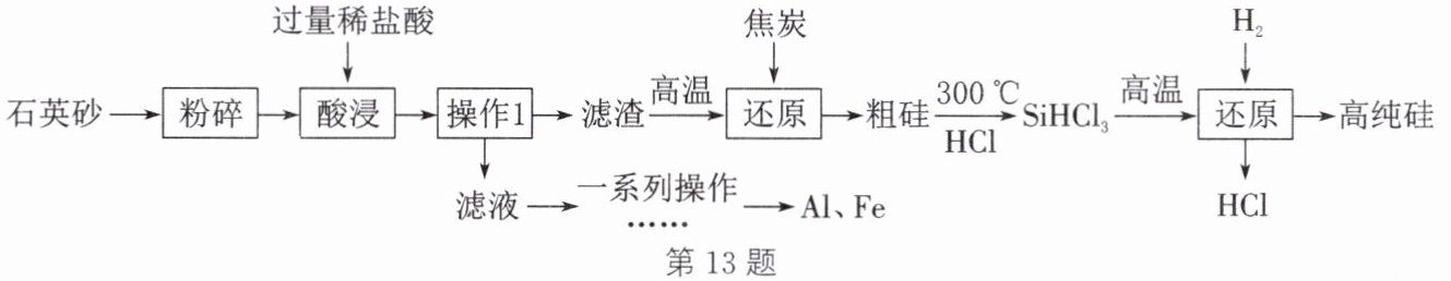 (填化学式)。答案:13. (1)+3 (2)过滤 (3)复分解反应 (4)$2C + SiO_{2}\stackrel{高温}{=\!=\!=}Si + 2CO\uparrow$ (5)HCl、H₂