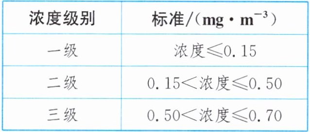 12. 某中学化学兴趣小组为测定工厂周围的空气中的二氧化硫含量是否符合国家标准,将工厂周围2m³空气通入含2.54mg碘(I₂)的碘水中,经测定I₂与二氧化硫恰好完全反应,生成硫酸和氢碘酸。通过计算说明此烟气排放后周围空气中二氧化硫的浓度级别。已知:我国空气质量标准对空气中二氧化硫的浓度级别规定如表所示(空气中二氧化硫的浓度用单位体积的空气中所含二氧化硫的质量表示)。