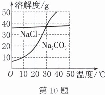 10. (2024·连云港)我国盐湖地区有“夏天晒盐($ {NaCl} $),冬天捞碱($ {Na_{2}CO_{3}} $)”的说法。$ {NaCl} $、$ {Na_{2}CO_{3}} $ 的溶解度曲线如图所示。下列说法中,正确的是 (