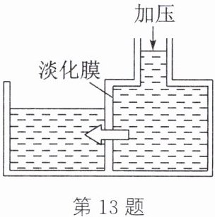 13. (科技民生)海水淡化可采用膜分离技术,如图所示。对淡化膜右侧的海水加压,水分子可以透过淡化膜进入左侧淡水池,而海水中的各种离子不能透过淡化膜,从而得到淡水。对加压后右侧海水成分进行分析,正确的是(
