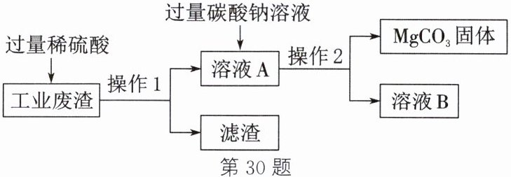 30. (2025·江西)碳酸镁是重要的化工原料。实验室以工业废渣(含MgCO₃、MgO、SiO₂)为原料制备MgCO₃的主要实验过程如图: