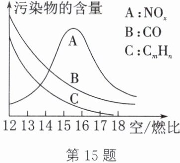(2) 为了减少雾霾、降低大气中有害气体含量,研究机动车尾气中$CO$、$NO_{x}$及$C_{m}H_{n}$的排放量意义重大。机动车尾气污染物的含量与“空/燃比”(空气与燃油气的体积比)的变化关系如图所示。
