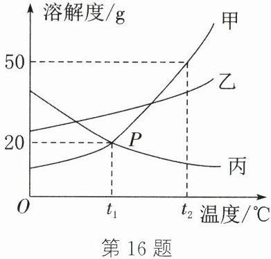 答案:16.(1)t₁℃时,甲和丙两种物质的溶解度相等,均是20g(合理答案均可) (2)10g (3)恒温增加丙物质(或恒温蒸发溶剂) (4)降温结晶 (5)ABD