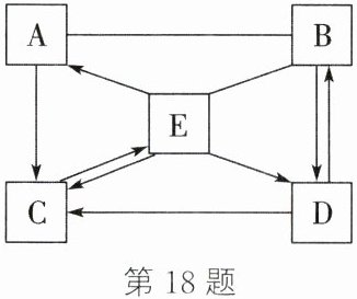 。答案:18.(1)CO₂ CaCO₃ (2)改良酸性土壤(合理答案均可) (3)有白色沉淀生成(或出现白色浑浊) (4)钠离子、氢氧根、水分子(或Na⁺、OH⁻、H₂O) 解析:A~E是初中化学常见的物质,D是大理石的主要成分,则D是碳酸钙。D、E中含有相同的金属元素,则E中含有钙元素,E能生成D(碳酸钙),则E可以是氢氧化钙。C是氧化物,D(碳酸钙)能生成C,C和氢氧化钙能相互转化,则C是水。B是氧化物,能和氢氧化钙反应,能和碳酸钙相互转化,则B是二氧化碳。氢氧化钙能与一种钠盐反应生成A,A能和二氧化碳反应,能反应生成水,且A和E(氢氧化钙)的物质类别相同,则A是氢氧化钠。代入验证,均符合题意。(1)由分析知,B是二氧化碳,化学式为CO₂;D是碳酸钙,化学式为CaCO₃。(2)E是氢氧化钙,氢氧化钙的一种用途是改良酸性土壤。(3)B和E在溶液中发生的反应是二氧化碳和氢氧化钙反应生成碳酸钙沉淀和水,实验现象是有白色沉淀生成或出现白色浑浊。(4)A物质是氢氧化钠,在水中能解离出自由移动的钠离子和氢氧根,所以其水溶液中一定含有的微观粒子是Na⁺、OH⁻、H₂O。