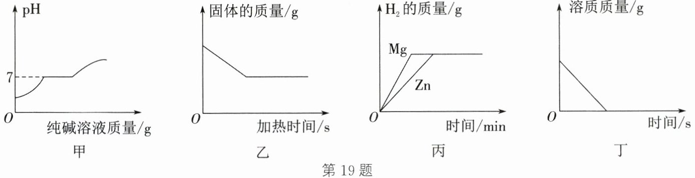 答案:19.D 解析:盐酸显酸性,氯化钙溶液显中性,则盐酸和氯化钙的混合溶液显酸性,pH小于7。向盐酸和氯化钙的混合溶液中逐滴加入纯碱溶液至过量,碳酸钠先与盐酸反应生成氯化钠、水和二氧化碳,盐酸逐渐被消耗,溶液酸性减弱,则pH逐渐增大。当盐酸与碳酸钠恰好完全反应时溶液呈中性,pH=7。继续滴加碳酸钠溶液,碳酸钠与氯化钙反应生成碳酸钙沉淀和氯化钠,该过程中溶液的pH不变。氯化钙完全反应后,继续滴加碳酸钠溶液,碳酸钠溶液显碱性,所以pH逐渐增大,选项A的图像正确。高锰酸钾在加热条件下分解生成锰酸钾、二氧化锰和氧气,氧气在通常状况下是气体,根据质量守恒定律,反应前后物质总质量不变,所以固体质量逐渐减少,由于锰酸钾、二氧化锰是固体,所以固体质量不会减少为零。高锰酸钾完全分解后固体质量不再变化,选项B的图像正确。向等质量的锌粉、镁粉中分别加入少量的相同浓度、相同质量的稀硫酸,根据金属活动性:镁>锌,镁与稀硫酸反应比锌与稀硫酸反应快。由于稀硫酸是少量的,所以生成氢气的质量由稀硫酸决定,则最终生成氢气的质量:镁=锌,选项C的图像正确。浓硫酸具有吸水性,长时间敞口露置于空气中会吸收水分而使溶液质量增大,但溶质质量不变,选项D的图像错误。