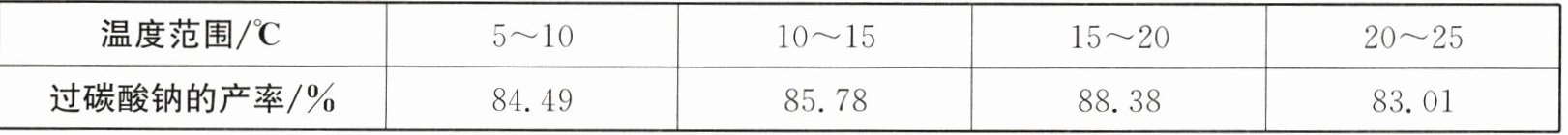 ②向饱和碳酸钠溶液中加入过氧化氢溶液的过程中,过碳酸钠的产率与反应温度的关系如表: