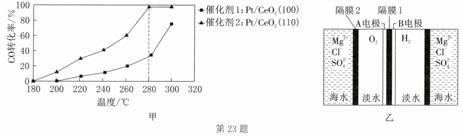 。答案:23.(1)无污染(合理答案均可) (2)$CO_2$ (3)催化剂2 280 (4)无副反应 (5)负 $2H_2O \stackrel{通电}{=} 2H_2 \uparrow + O_2 \uparrow$
