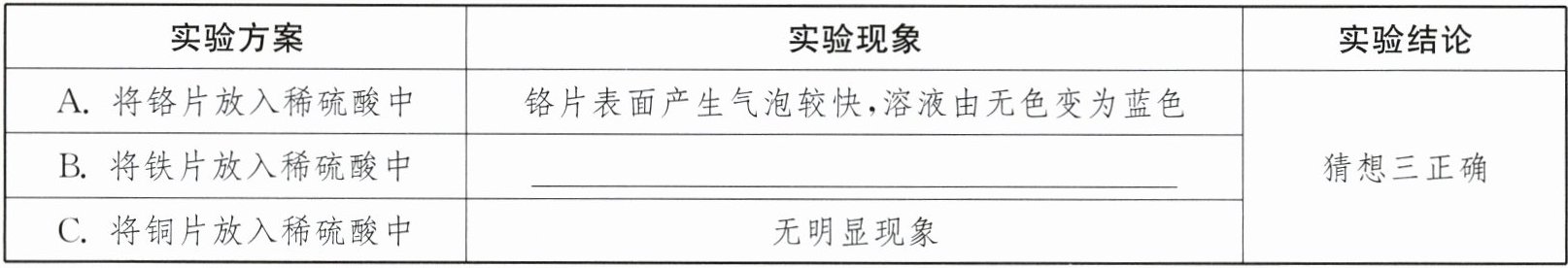 (1)猜想一:Fe>Cu>Cr;猜想二:Fe>Cr>Cu;猜想三:
