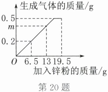 答案:20.(1)0.4 (2)解:由图像可看出,锌粉有剩余,生成氢气0.5g,说明硫酸完全反应。设该稀硫酸中溶质的质量分数为x。
