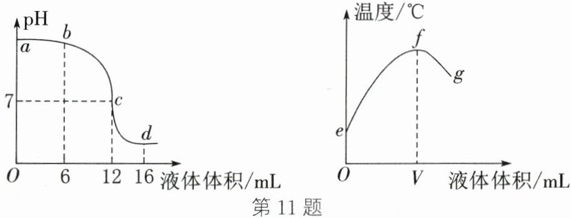 答案:11.C 解析:由pH变化曲线知,溶液初始的pH大于7,溶液显碱性,则该实验是将稀盐酸滴加到氢氧化钠溶液中,选项A的说法正确;氢氧化钠与盐酸反应生成氯化钠和水,由pH变化曲线知,b点时溶液的pH大于7,溶液显碱性,说明氢氧化钠还未反应完,则b点所示溶液中存在的溶质是生成的$\mathrm{NaCl}$和未反应完的$\mathrm{NaOH}$,选项B的说法正确;由pH变化曲线知,d点时溶液的pH小于7,溶液显酸性,说明稀盐酸过量,则d点处溶液中的$\mathrm{Na}^+$个数小于$\mathrm{Cl}^-$,选项C的说法不正确;由温度变化曲线知,图中$e\rightarrow f$温度升高,说明该反应是放热反应,选项D的说法正确。