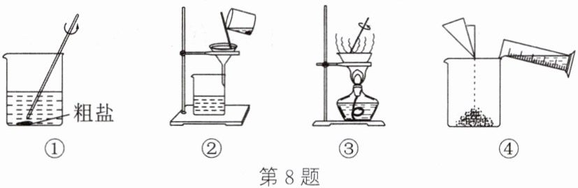 8. 小文做粗盐(含难溶性杂质)初步提纯的实验并计算精盐产率,如图是部分操作示意图,请回答:(精盐产率是所得精盐质量占溶解的粗盐质量的百分率)