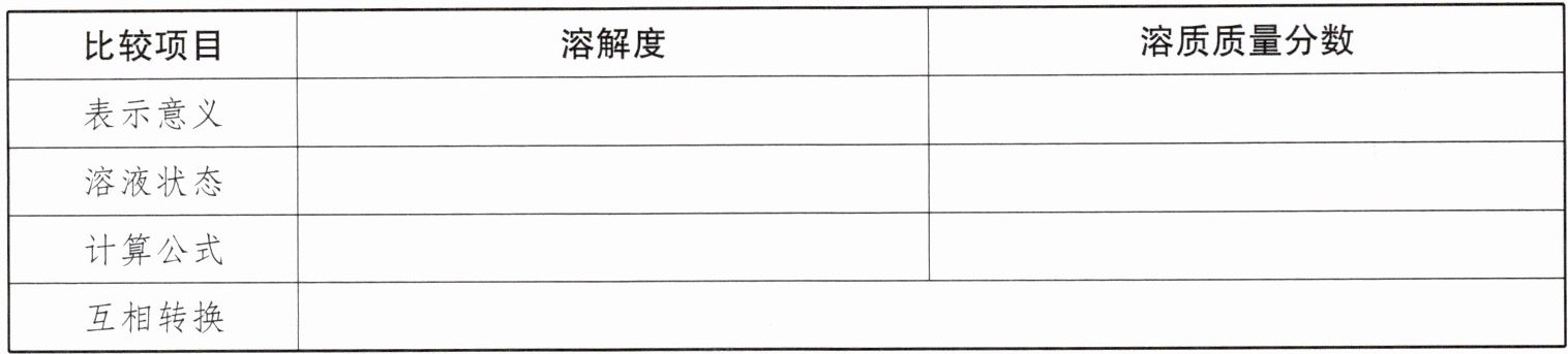 答案:2.溶解性强弱 浓度大小 饱和 不确定 $S=\frac{m_{质}}{m_{剂}}×100g$ $w_{质}=\frac{m_{质}}{m_{液}}×100\%$ 饱和溶液中$w_{质}=\frac{S}{S + 100g}×100\%$