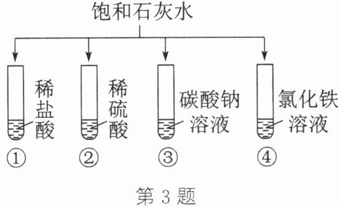3. (创新实验)如图所示,分别向四支试管中加入饱和石灰水,使其与试管内溶液充分反应。无论加入多少饱和石灰水,反应后试管内溶液一定呈碱性的是(资料:氢氧化钙与盐酸反应生成氯化钙和水,与稀硫酸反应生成硫酸钙和水,氯化钙和硫酸钙的溶液均呈中性)(