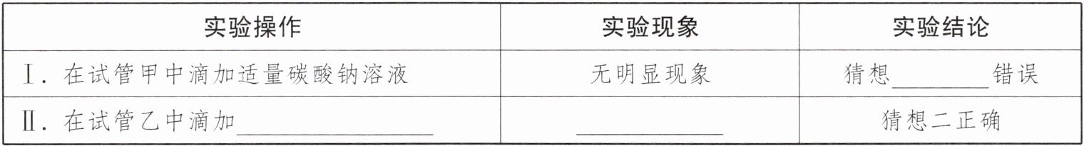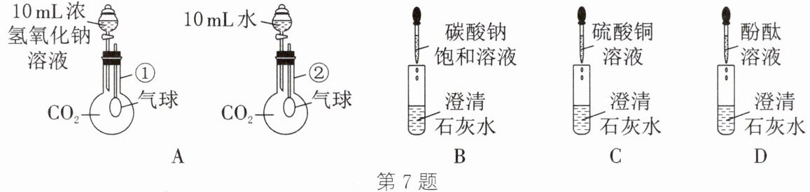答案:7.(1)氢氧化钠能与二氧化碳反应 (2)$\mathrm{CuSO}_4 + \mathrm{Ca(OH)}_2 \xlongequal{} \mathrm{Cu(OH)}_2 \downarrow + \mathrm{CaSO}_4$ 酚酞变红 (3)Ⅰ.三 Ⅱ.足量稀盐酸(合理答案均可) 产生气泡(或一开始滴加稀盐酸时无明显现象,继续滴加稀盐酸有气泡产生,现象与前一空对应,合理答案均可)