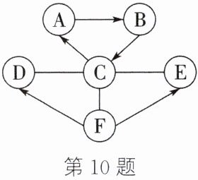 。答案:10. (1)生石灰 (2)酸 (3)氢氧根和氢离子结合生成水分子(或$OH^-$和$H^+$结合生成$H_2O$) (4)有红褐色沉淀生成 解析:B可用作食品干燥剂,则B是氧化钙;E由两种元素组成,其溶液呈黄色,则E是氯化铁;C、D、E、F分别是氧化物、酸、碱、盐四种不同类别的化合物,E为盐,可知C、D、F分别为氧化物、酸、碱中的某一种;A、B、C中含有相同的金属元素,且B可转化为C,A可转化为B,C可转化为A,则A是碳酸钙,C是氢氧化钙;C为碱,则D、F分别为氧化物、酸中的某一种;F可与C反应,且F可转化为D或E,则F是稀盐酸;C可与D反应,则D是二氧化碳。(1)B是氧化钙,俗称是生石灰。(2)F是稀盐酸,属于酸。(3)C和F的反应为氢氧化钙与稀盐酸反应生成氯化钙和水,反应的微观实质是氢氧根和氢离子结合生成水分子。(4)C和E的反应为氢氧化钙与氯化铁反应生成氢氧化铁沉淀和氯化钙,观察到产生红褐色沉淀。