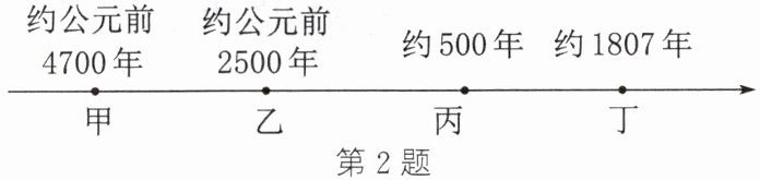 2. 一般来说,金属越活泼,冶炼越困难,人类利用该金属的时间就越迟。如图为铁、铜、钠、锌四种金属的最早冶炼历史年代,则甲代表的金属是(