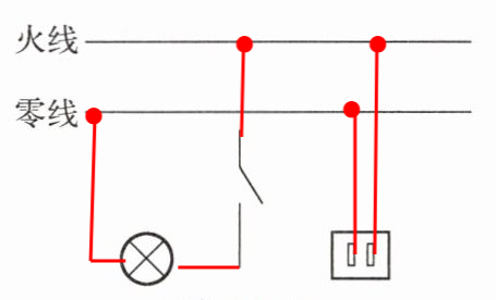 电路连接:开关串联在火线与照明灯的顶端金属点之间,照明灯的螺旋套接零线;插座左孔接零线,右孔接火线,且插座与照明灯并联(对应画出符合要求的电路图即可)。