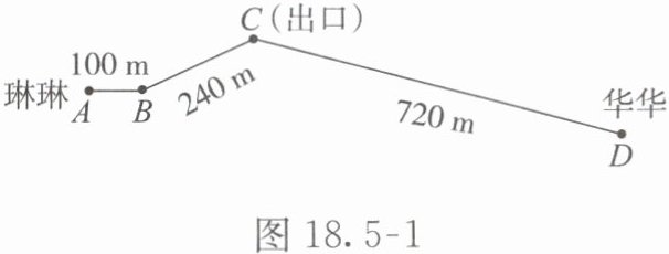 · 跟踪练习 2 如图 18.5-1,琳琳和华华周末到家乡美食小镇游玩,两人同时分别到达小吃摊位 A 和 D,并约在出口 C 会合。琳琳从摊位 A 经过摊位 B,最后到达出口 C,华华从摊位 D 直接前往出口 C,速度与琳琳从摊位 B 到出口 C 的速度相同,两人在每两个地点间均匀速前进,各点间距离如图所示。若琳琳从摊位 A 到摊位 B 的速度比从摊位 B 到出口 C 的速度慢 10 m/min,且从摊位 A 到摊位 B 的时间为从摊位 B 到出口 C 时间的一半,则 (填“琳琳”或“华华”)先到达出口 C。