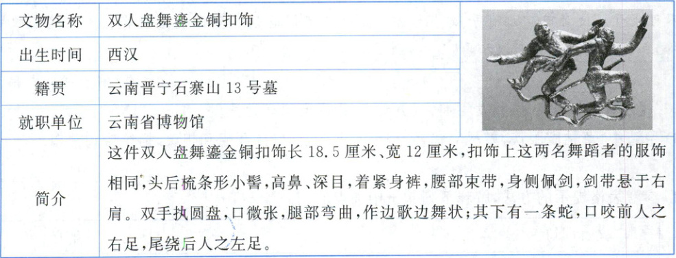 7. 跨学科 历史 在参观双人盘舞鎏金铜扣饰的时候,小艺产生了很多疑问,请你根据以下材料将小艺和小思的对话补充完整。